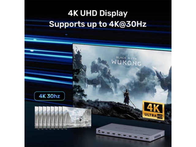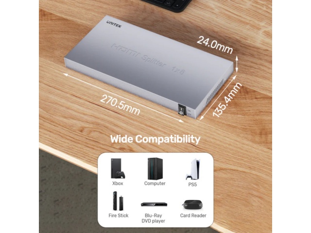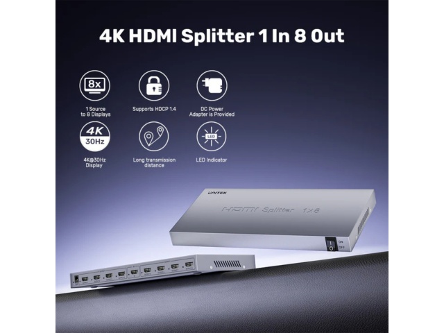 El splitter Unitek 4K permite multiplicar una entrada HDMI en 8 salidas idénticas sin perder calidad de imagen y audio.