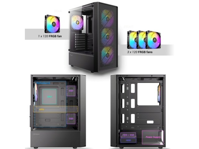 3 ventiladores de RGB fijo 120mm preinstalados en la parte delantera + 1 ventilador RGB fijo 120mm en la parte trasera.