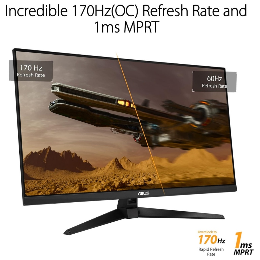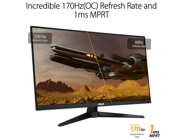 El TUF Gaming VG32AQA1A ofrece imágenes impresionantes desde todos los ángulos. Con una frecuencia de actualización de 170 Hz, reduce el lag y el desenfoque de movimiento para que tengas la ventaja en juegos de disparos en primera persona, carreras, estrategia en tiempo real y deportes. Esta frecuencia de actualización ultrarrápida te permite jugar con la configuración visual más alta y reaccionar al instante a lo que aparece en pantalla, para que puedas dar el primer golpe.