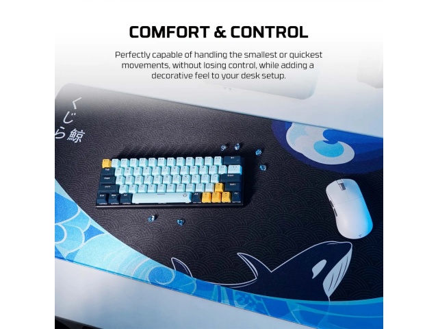 La FANTECH ATO KUJIRA MP905 es una alfombrilla de escritorio de tamaño extendido (XL) diseñada tanto para jugadores como para usuarios que buscan mejorar la estética y funcionalidad de su espacio de trabajo. Perteneciente a la serie ATO de Fantech, este modelo se destaca por su diseño artístico inspirado en el arte minimalista japonés, específicamente en motivos marinos como se sugiere en sus variantes "Umi" (mar) y "Nami" (ola).
