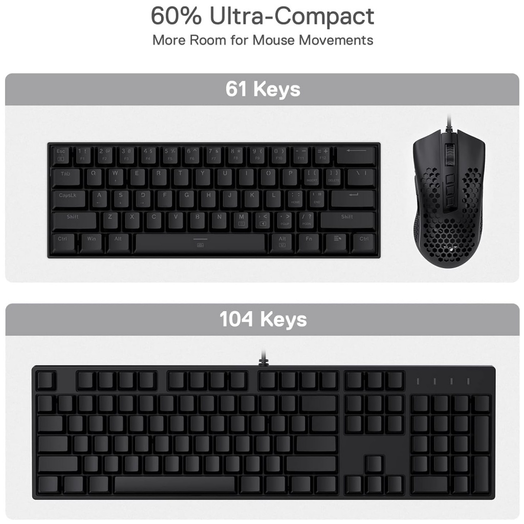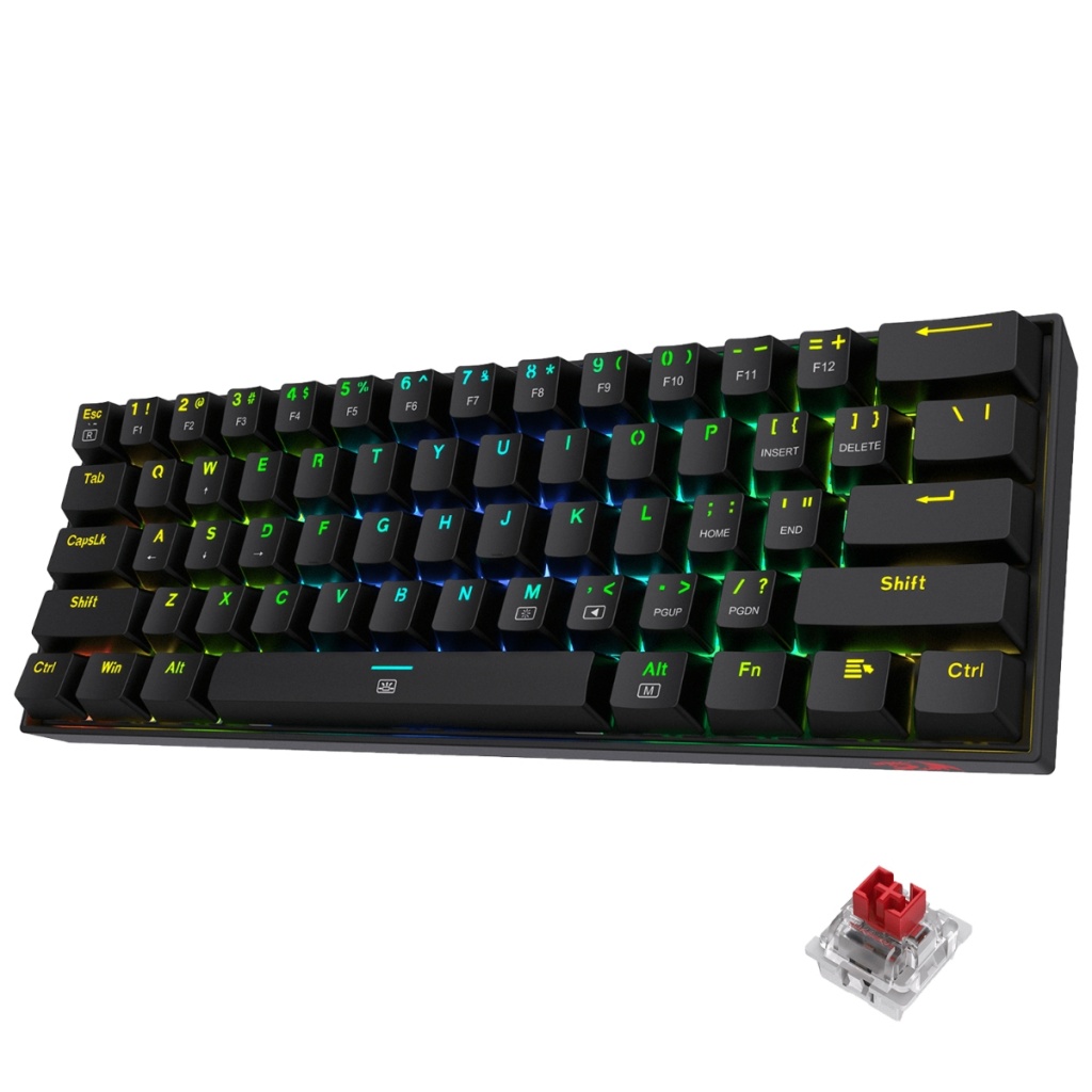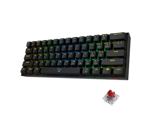 El Dragonborn es un teclado mecánico 60%, compacto, robusto y súper transportable, con prestaciones óptimas para el juego competitivo de alto nivel: switches Redragon Red, tecla Fn, bloqueo de tecla de Windows, cable desmontable y la mejor calidad de construcción.