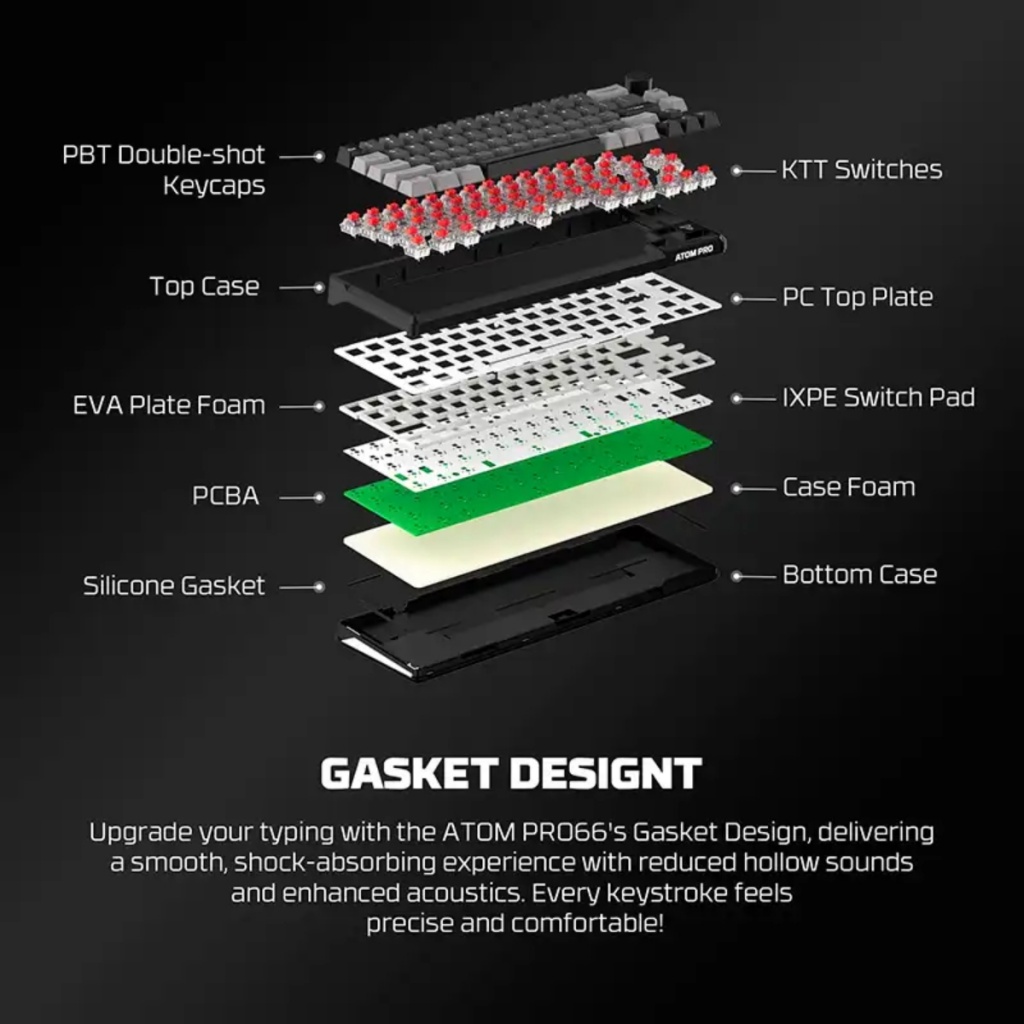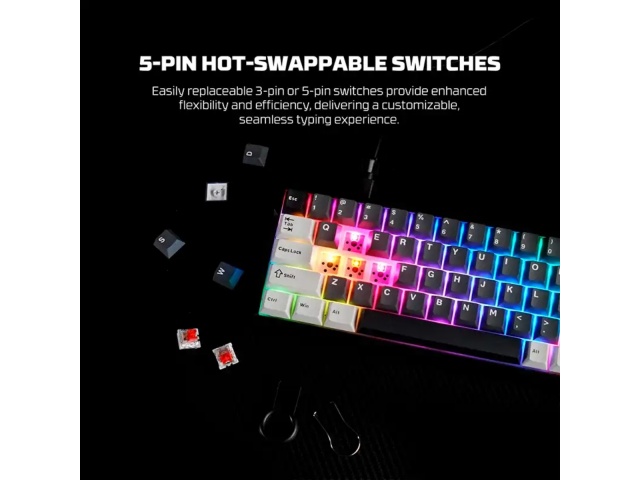 Interruptores Mecánicos Hot-Swappable: Equipado con interruptores mecánicos (comúnmente Huano Red o Blue), permite a los usuarios cambiar los switches sin necesidad de soldadura. Esto facilita la personalización de la sensación de escritura y el sonido del teclado.