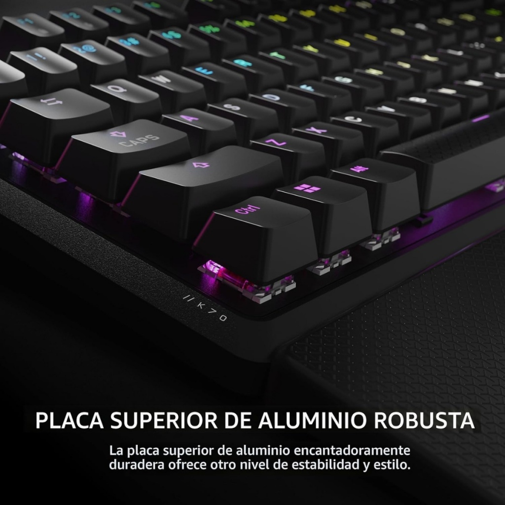 El K70 CORE es un teclado de tamaño completo (100%) que utiliza interruptores mecánicos lineales para una pulsación fluida. Su construcción se centra en la durabilidad y el confort acústico, incorporando dos capas de espuma amortiguadora de sonido que eliminan los ruidos metálicos o "clics" excesivos, ofreciendo un sonido de tecleo más profundo y satisfactorio. Además, cuenta con una placa superior de aluminio que le otorga rigidez y un aspecto elegante.