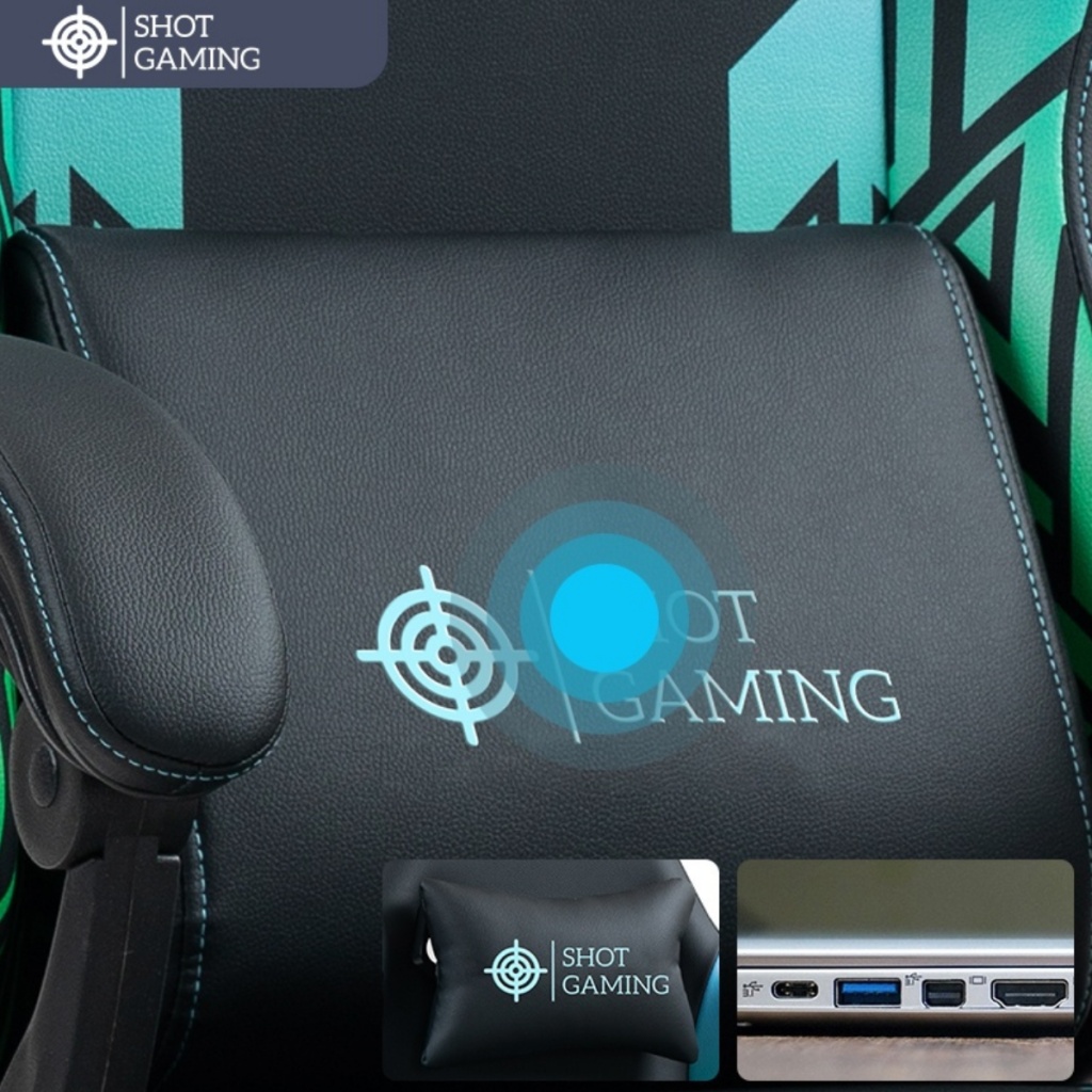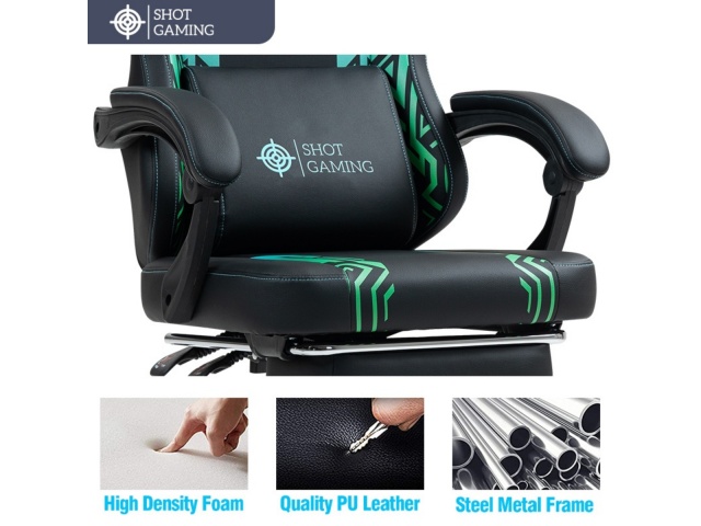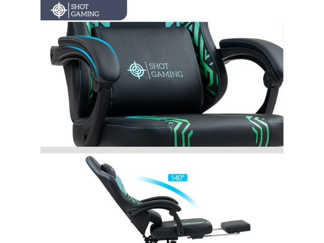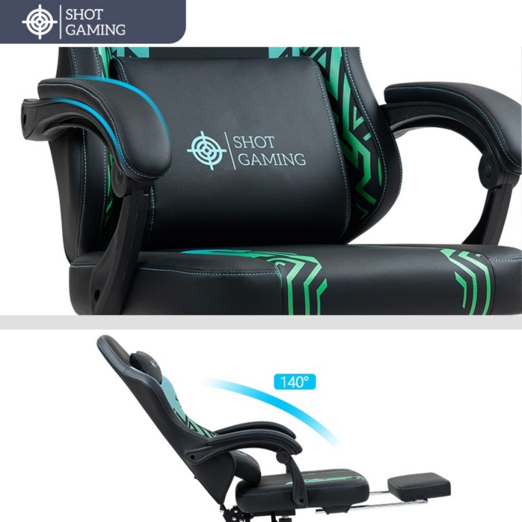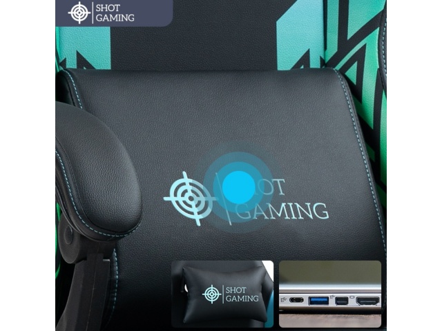 La silla gamer Shot Gaming SHOT-D1140-GB combina cuero PU, espuma de alta densidad y estructura de acero reforzada para máximo confort y durabilidad. Con respaldo reclinable 90°-140° , almohada lumbar con masajeador, apoyabrazos ajustables, apoyapiés retráctil y altura regulable, ofrece ergonomía total y soporte completo para largas sesiones de juego. 5 ruedas giratorias y base con pistón de gas garantizan estabilidad y movilidad, todo con un diseño negro con detalles geométricos moderno y resistente.