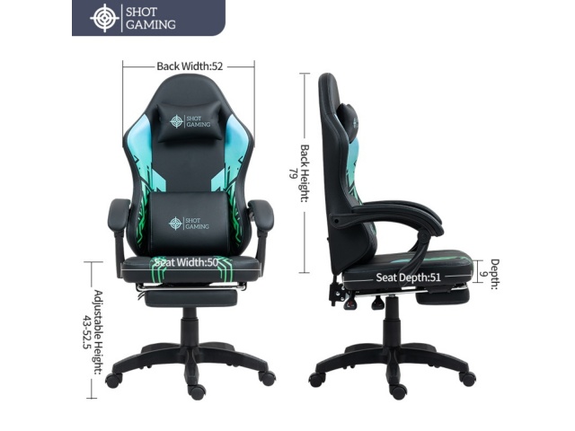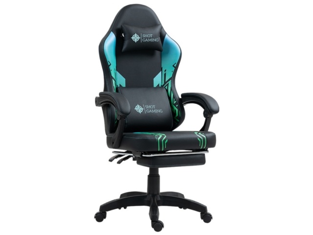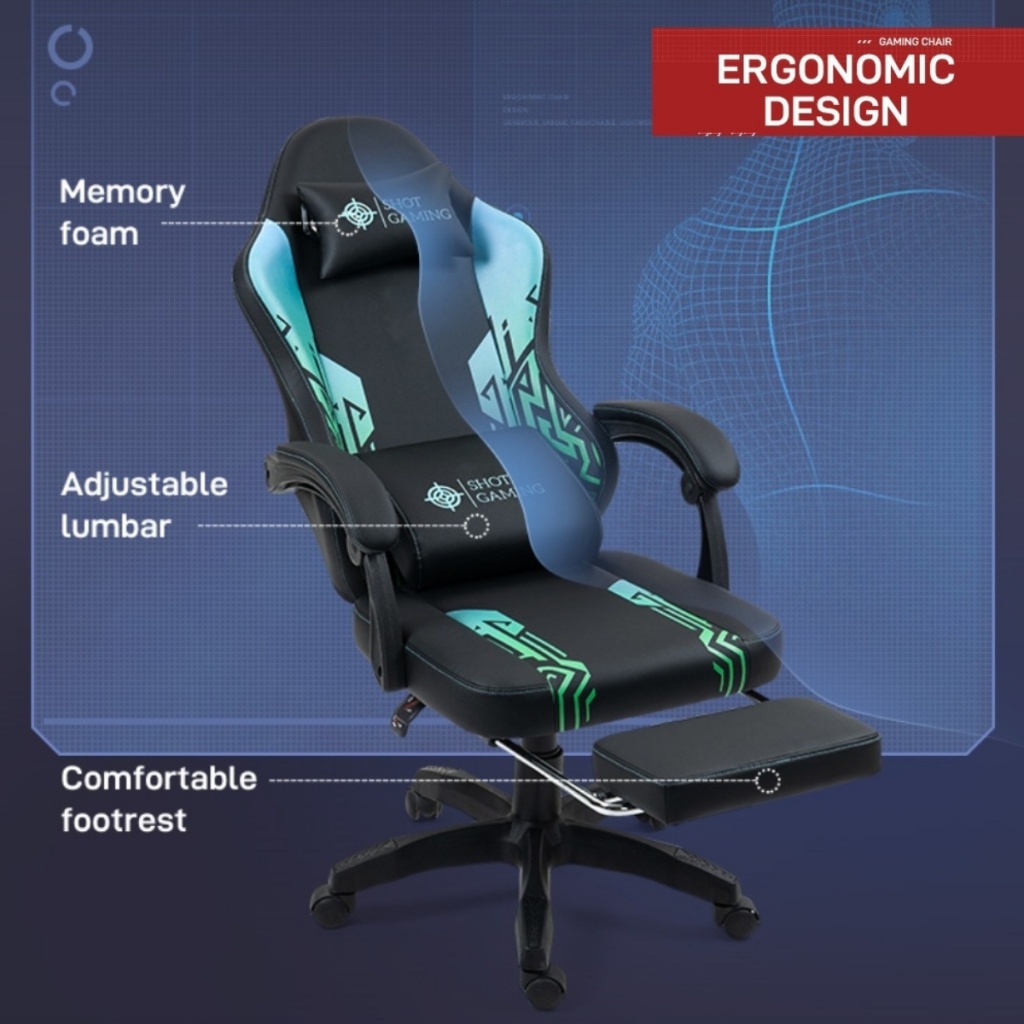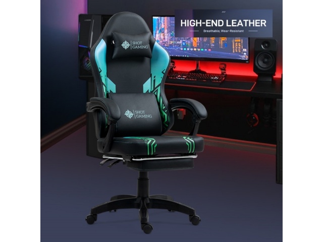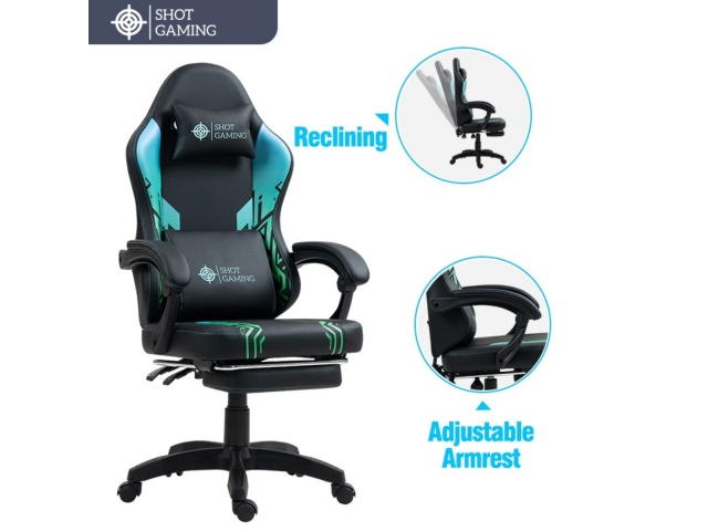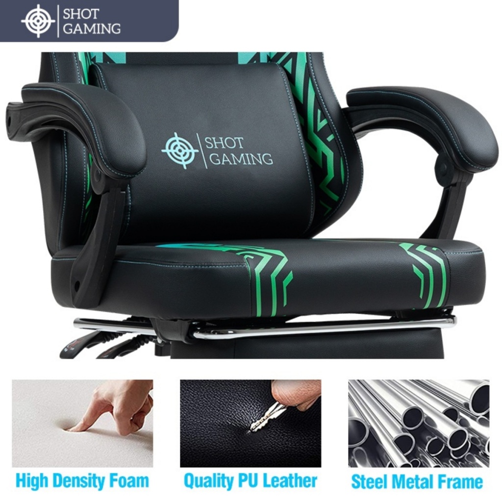 La silla gamer Shot Gaming SHOT-D1140-GB combina cuero PU, espuma de alta densidad y estructura de acero reforzada para máximo confort y durabilidad. Con respaldo reclinable 90°-140° , almohada lumbar con masajeador, apoyabrazos ajustables, apoyapiés retráctil y altura regulable, ofrece ergonomía total y soporte completo para largas sesiones de juego. 5 ruedas giratorias y base con pistón de gas garantizan estabilidad y movilidad, todo con un diseño negro con detalles geométricos moderno y resistente.