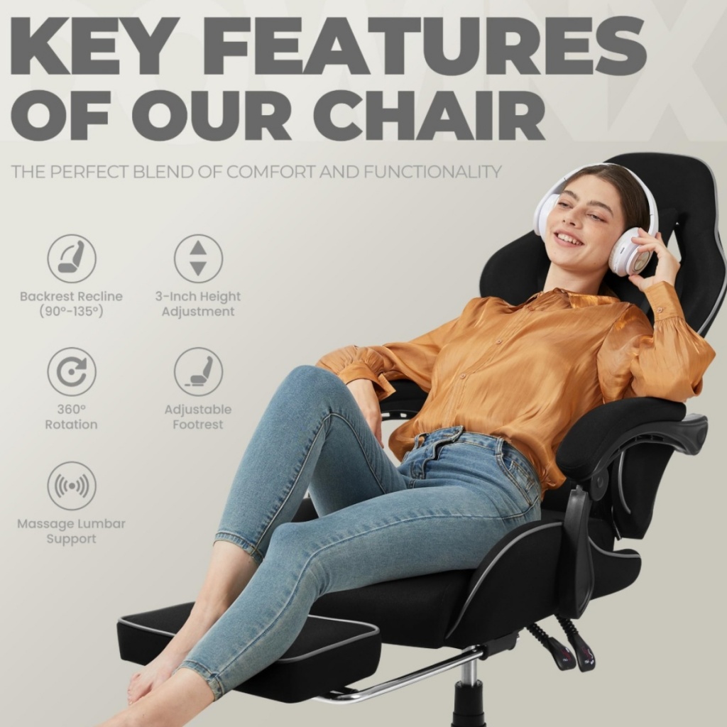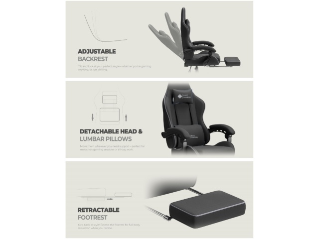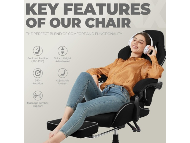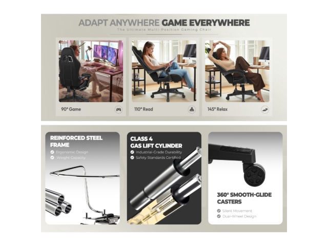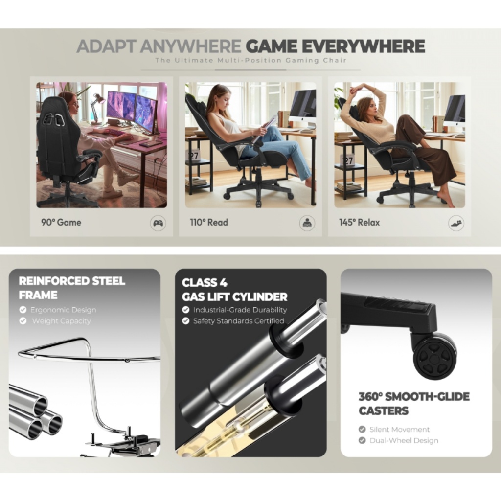 Incluye inclinación de 90° a 145° con bloqueo, apoyapiés retráctil, almohadas desmontables y función de masajeador lumbar, ofreciendo ergonomía y comodidad para largas sesiones.