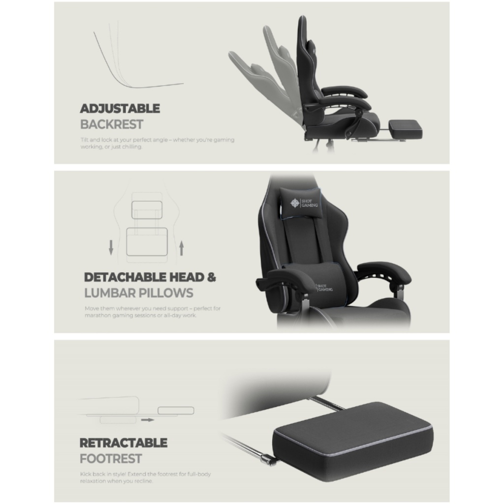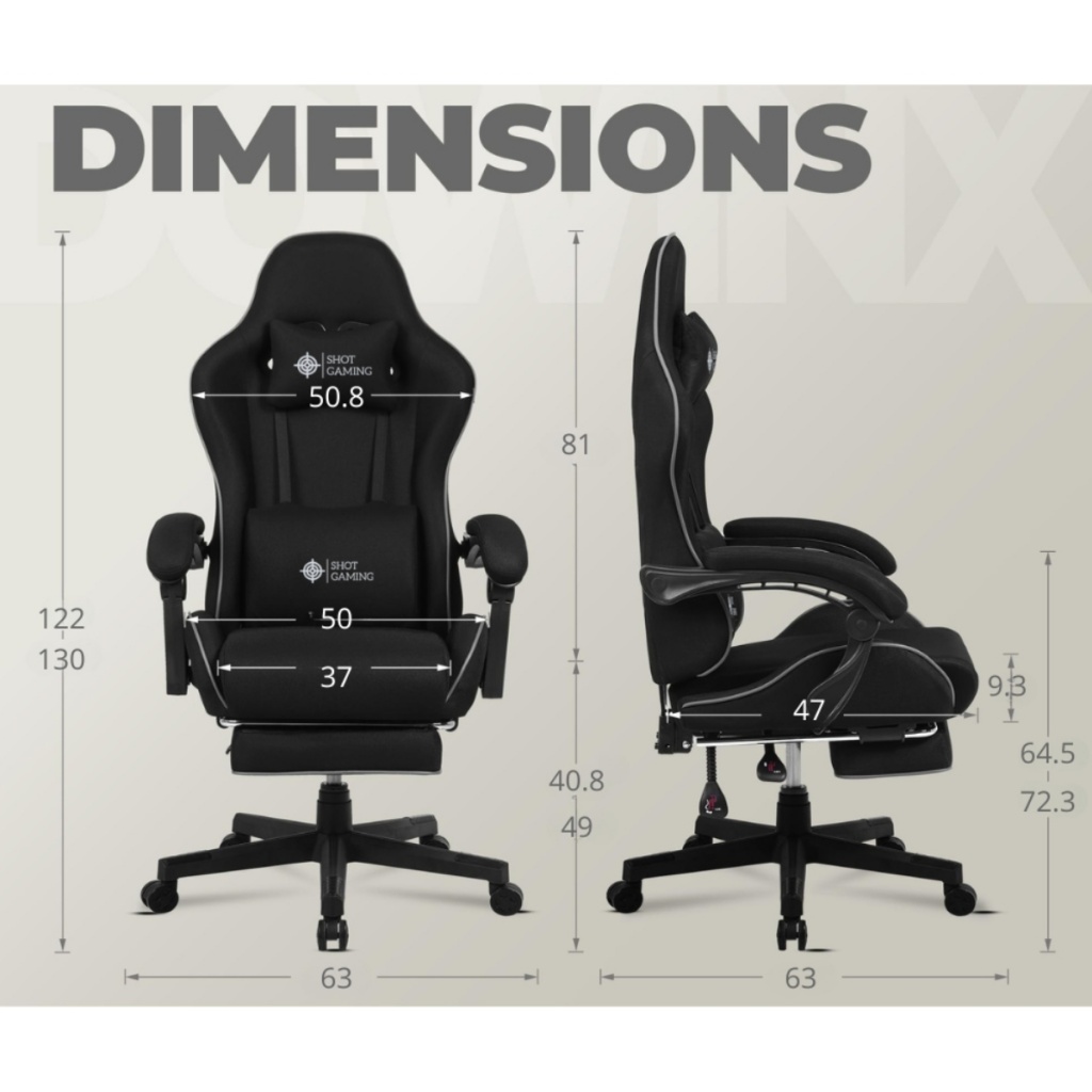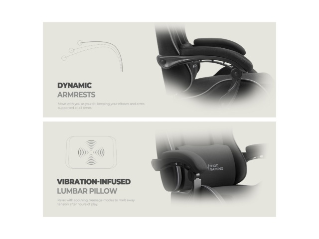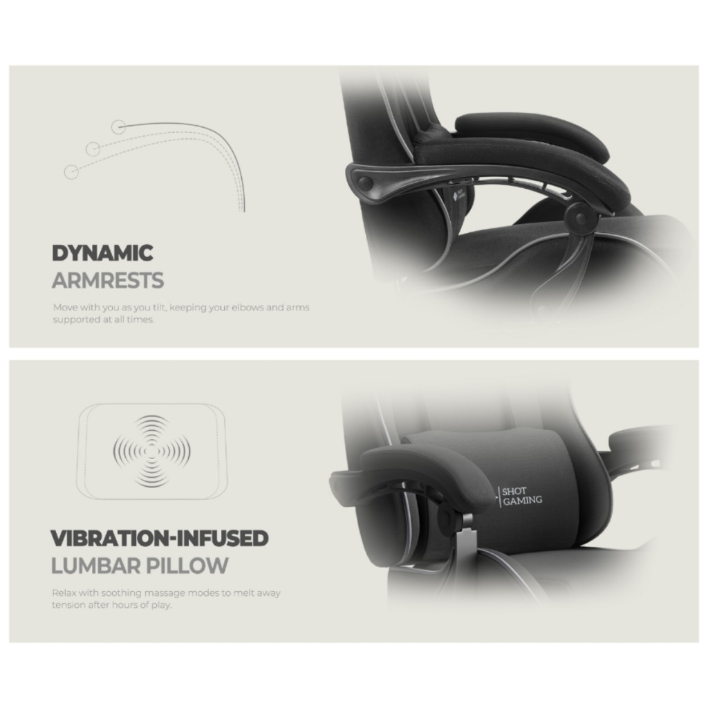 La silla gamer Shot Gaming SHOT-LS6658-B combina tejido suave y resistente, espuma de alta densidad, sistema de resortes individuales tipo pocket para un confort superior.